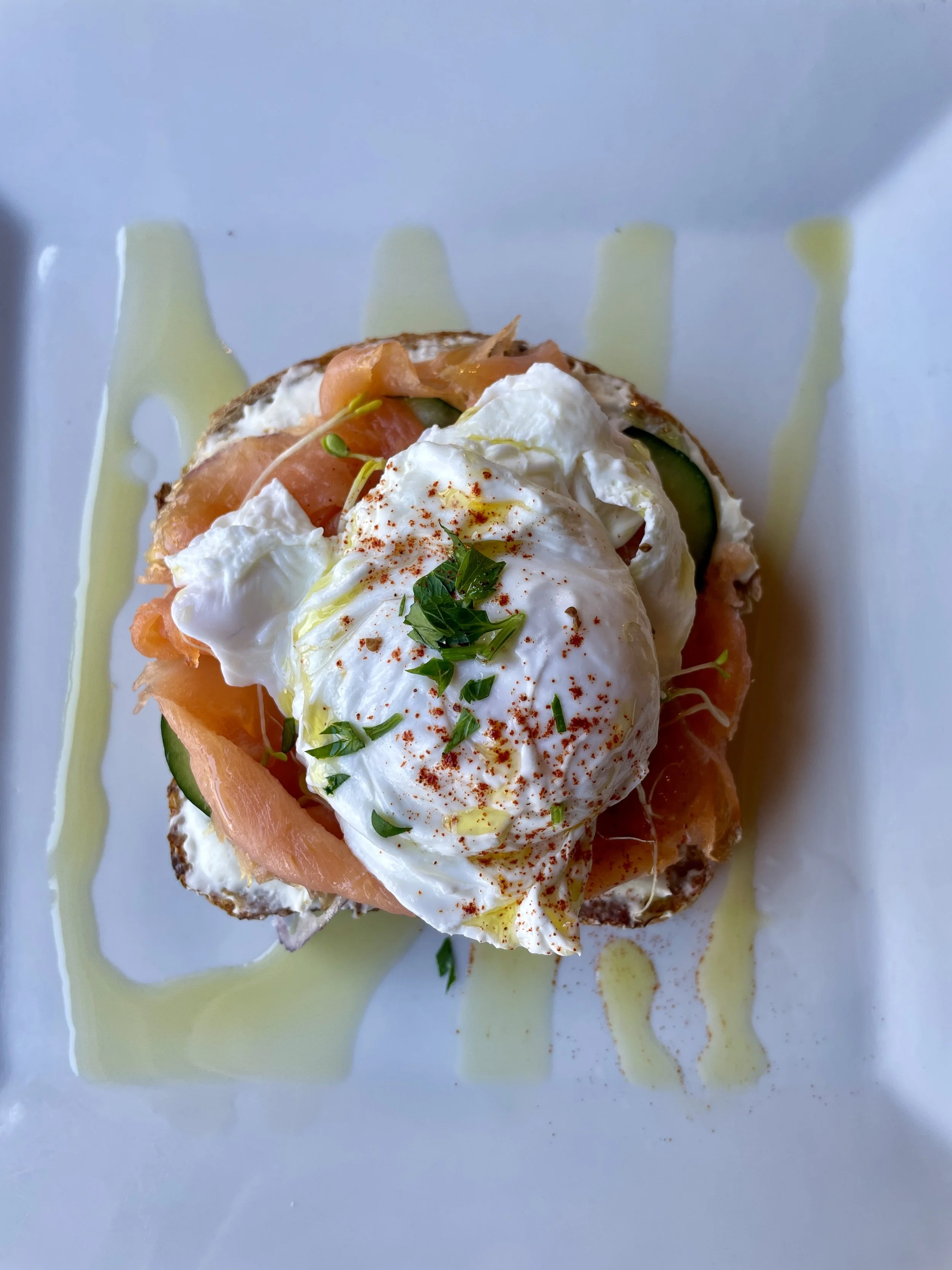 Front Porch Bakery sourdough topped with choice of cream cheese or house-made hummus, smoked salmon*, red onions, capers, sprouts, and topped with a free-range poached egg*.