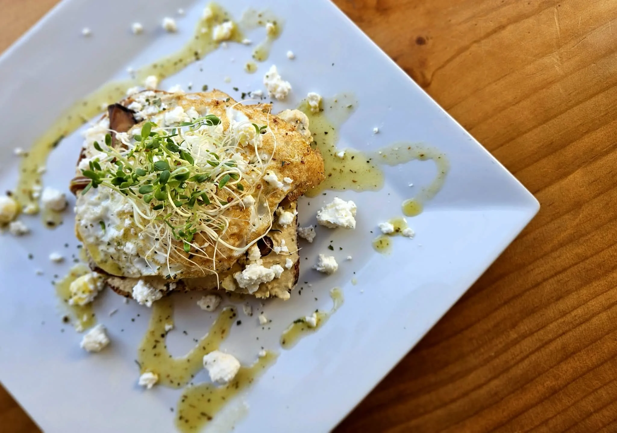Hummus + Wild Mushroom Toast - Front Porch sourdough with housemade hummus, MycoPolitan mushrooms, onions, & sprinkle of feta. With added over-easy egg.