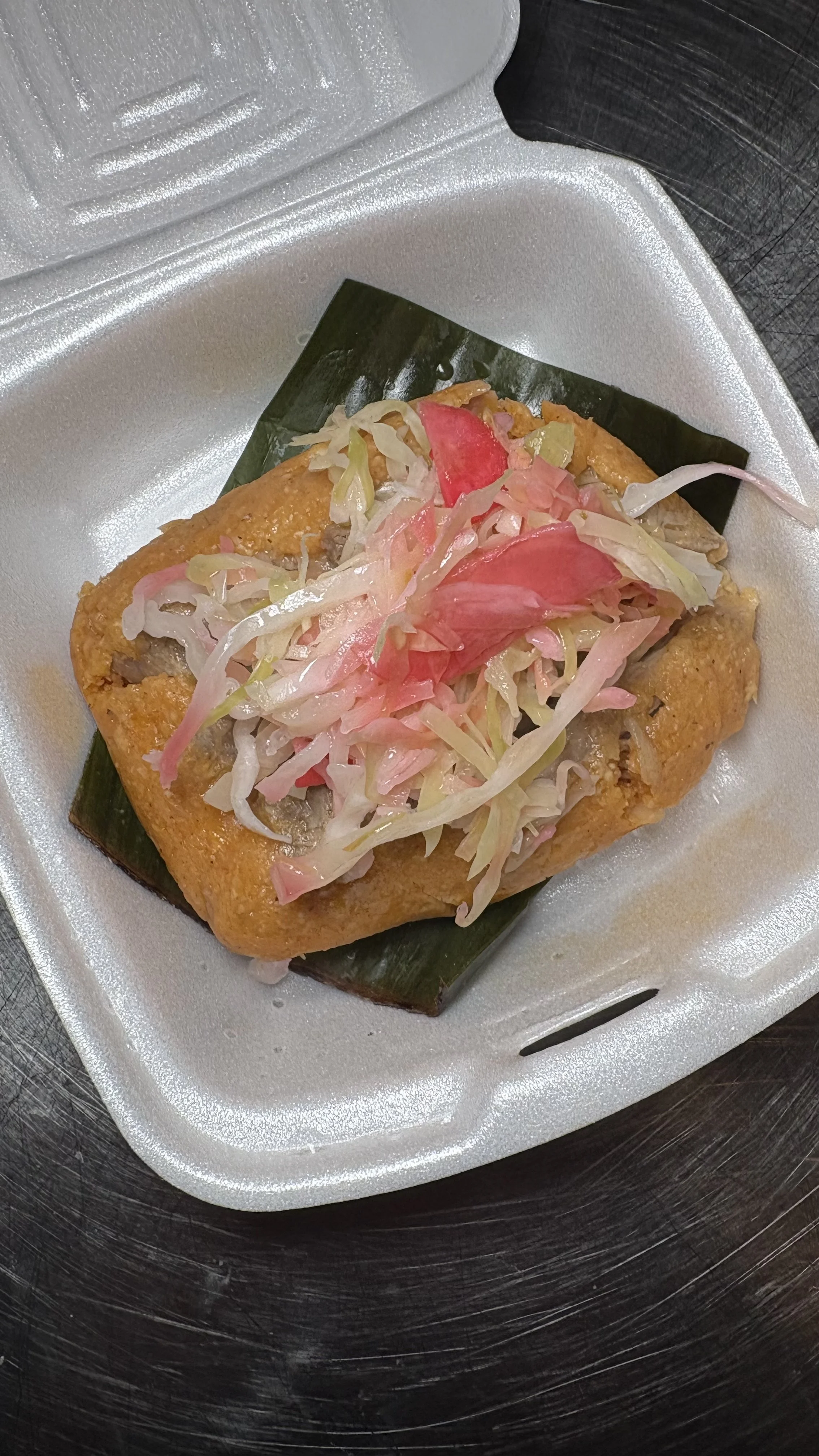 A traditional tamale with slow-braised pork cooked in achiote, Peruvian panca pepper, and sofrito, wrapped in house-made corn masa and steamed until tender and rich with flavor.