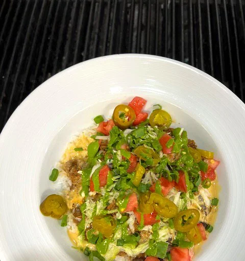 Two soft flour tortillas filled with Split Piedmontese grass-fed all-natural beef hot dog, queso sauce, and Sweet Heat relish and Fried Onion.