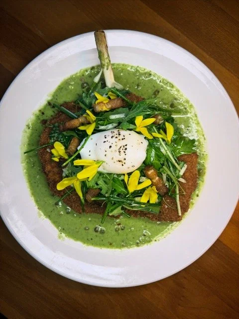 Pork Milanese- poached duck egg, house cured pancetta cotto, mizuna salad.