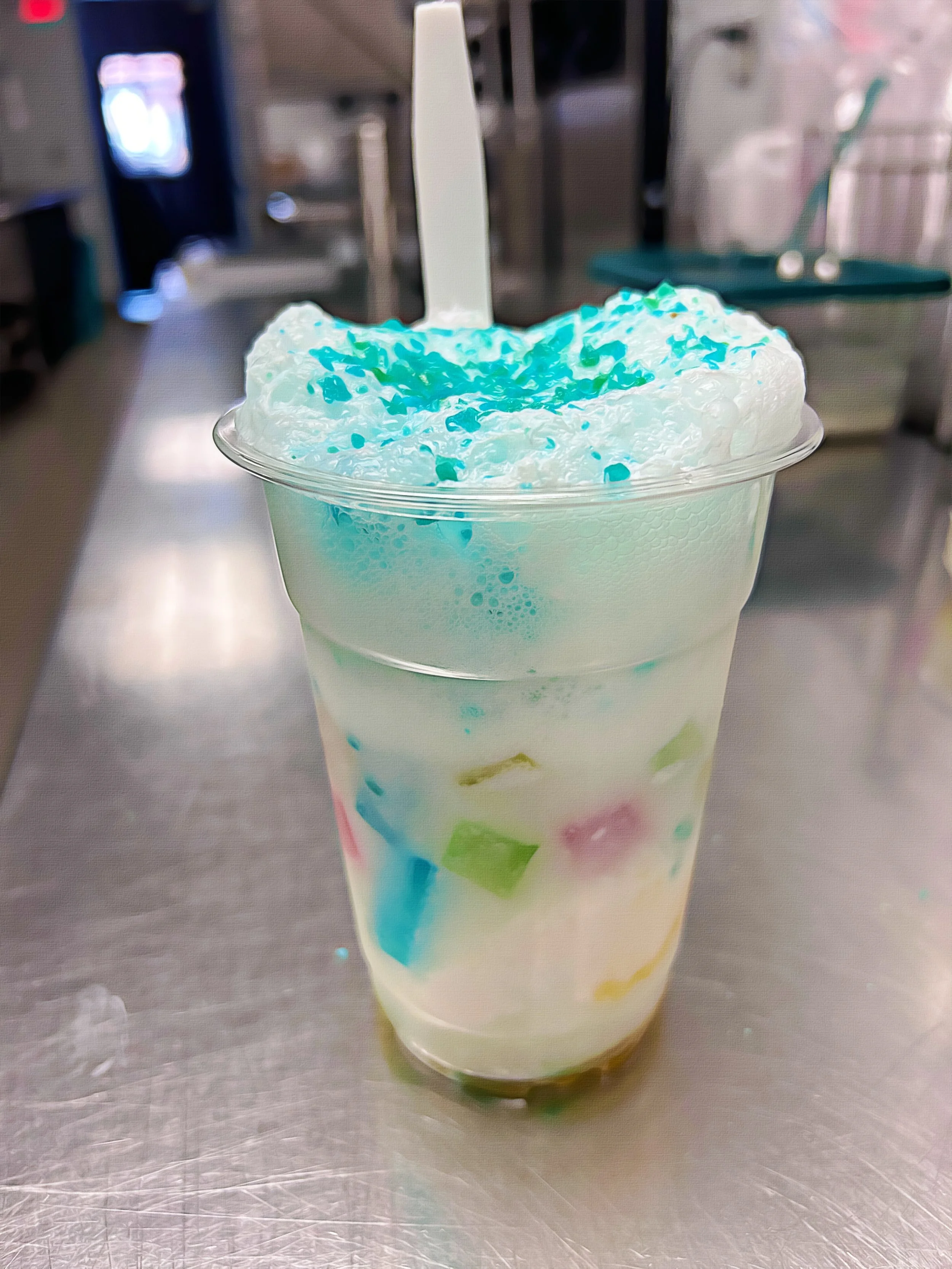 The Mosaic Gem Float is available in Peach or Strawberry. It's made with local (or vegan) vanilla ice cream & includes 6 rainbow colors of our own crystal gem mosaic candy cubes {Khohakutou}.